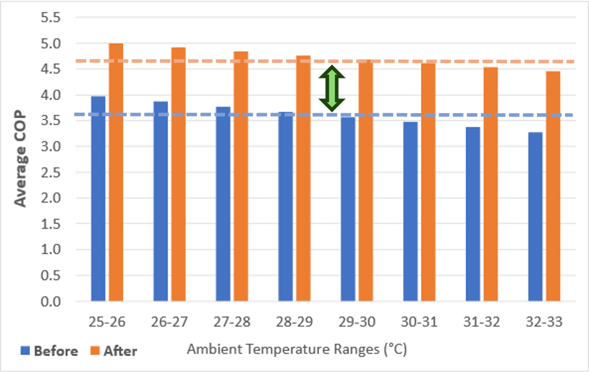 We have successfully deployed 13,545 RT (47.7MW) of cooling capacity, delivering energy efficiency improvements on average of 15 to 30%, saving our clients ~5.4 GWh/y per year and ~3,660t CO2eq /yr.